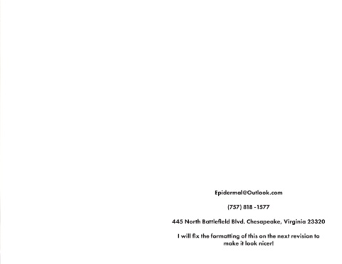 Epidermal@Outlook.com (757) 818 -1577 445 North Battlefield Blvd. Chesapeake, Virginia 23320 I will fix the formatting of this on the next revision to make it look nicer!